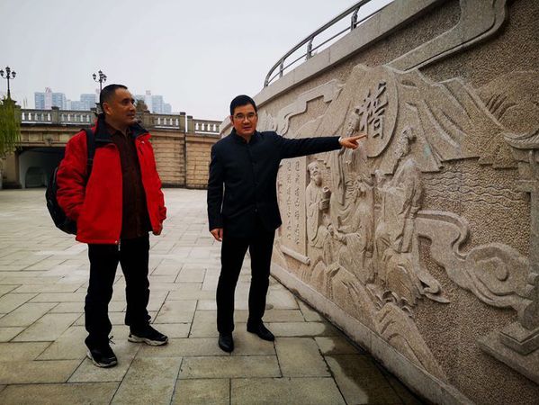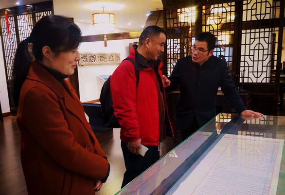 王建忠(右)讲述耕读传家里的稽山鉴水