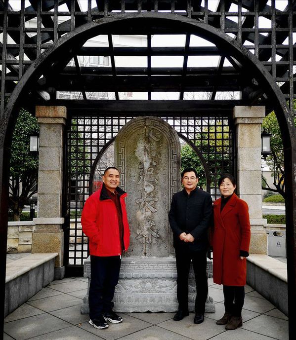校长助理王建忠(中)、学院党委委员、宣传部长冯丽琴(右)在“翰苑长春”石碑前纵论石文化。